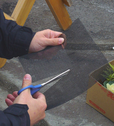 長めのUの字を作れる様に針金を切り、 針金を鉢に開いている穴に下から通します。 鉢底ネットも通して固定します。 (針金は、後で余分な部分を切ればいいので 長めにしておきます。) |